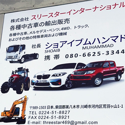 | 【会社名】株式会社THREE STAR INTERNATIONAL 【代表取締役】ショエイブ ムハンマド 【所在地】 〒989-1503 宮城県柴田郡川崎町川内字荒羽賀山1-1 【TEL】 0224-51-8827 【FAX】 0224-51-8921 【MOB】 080-6625-3344 【事業内容】中古車・中古部品の買取、販売、輸出入 【設立】令和4年1月11 【資本金】金500万円 【古物商許可】宮城県公安委員会 第221100000495号 お問合せはコチラから |